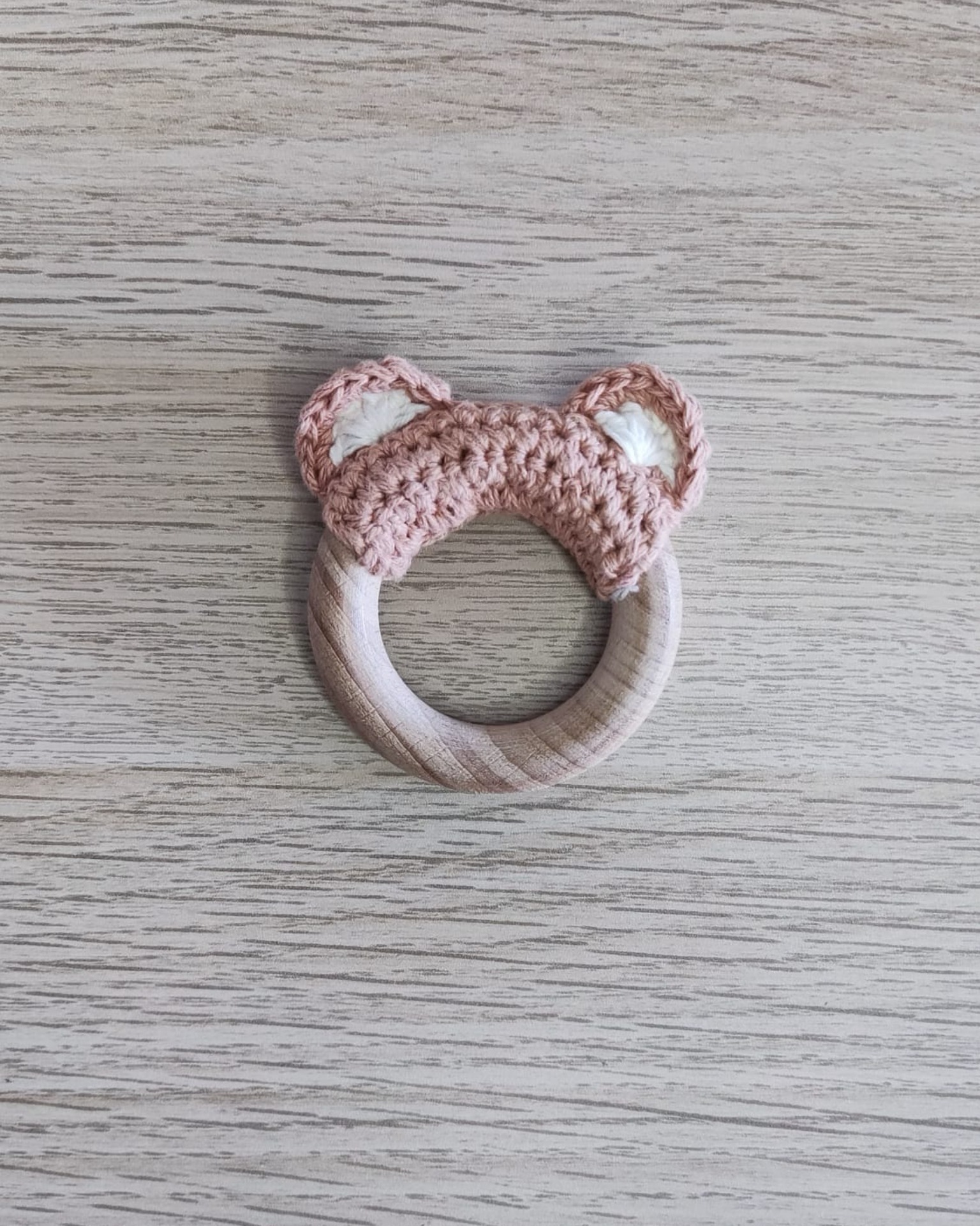 Pequeño mordedor con madera y punto de dos tonalidades. Color Marrón y color Crema.